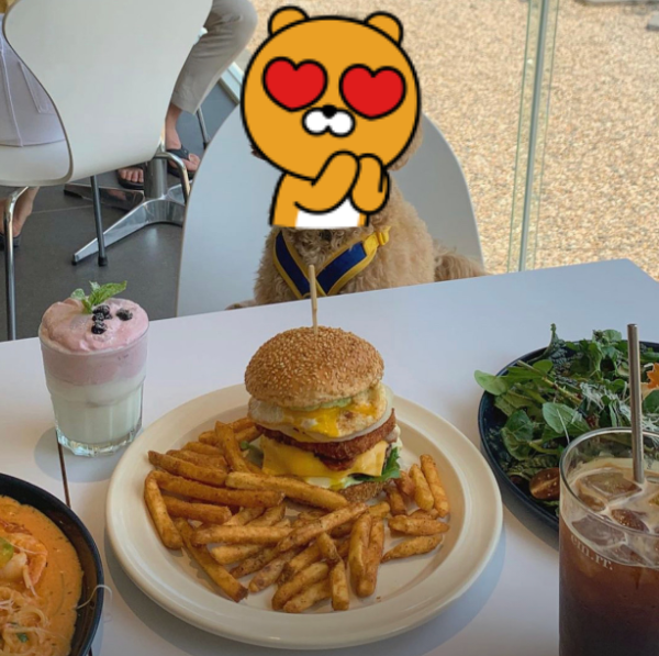 넓은 창가 자리에서 커피를 즐기며 뛰어노는 강아지를 바라보는 풍경은 그 자체로 힐링. 브런치 메뉴도 잘 갖춰져 있어 산책 겸 점심 식사 장소로도 추천해요.